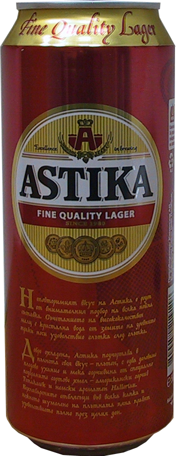 Astika is a brewery making a blond pilsener with an alcohol content of 5% ABV in the city of Haskovo, in southern Bulgaria. The brand has a leading position in the Bulgarian premium segment. The brewery draws on the best deep-lying water in Thrace. Astika is characterized by a pale golden hue, a long-lasting white foam, and a taste which balances a slightly honey like flavor with a soft bitterness. It should be served cold at 5°C.